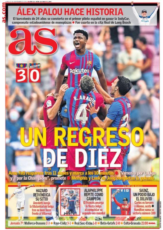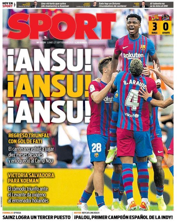 L’edizione odierna dei quotidiani sportivi spagnoli dedica ampio spazio al ritorno in campo con gol di Ansu Fati. L’attaccante classe 2002, infatti, è stato protagonista ieri in Barcellona-Levante, siglando la rete del definitivo 3-0 dieci minuti dopo il suo ingresso sul terreno di gioco. Di seguito le aperture.