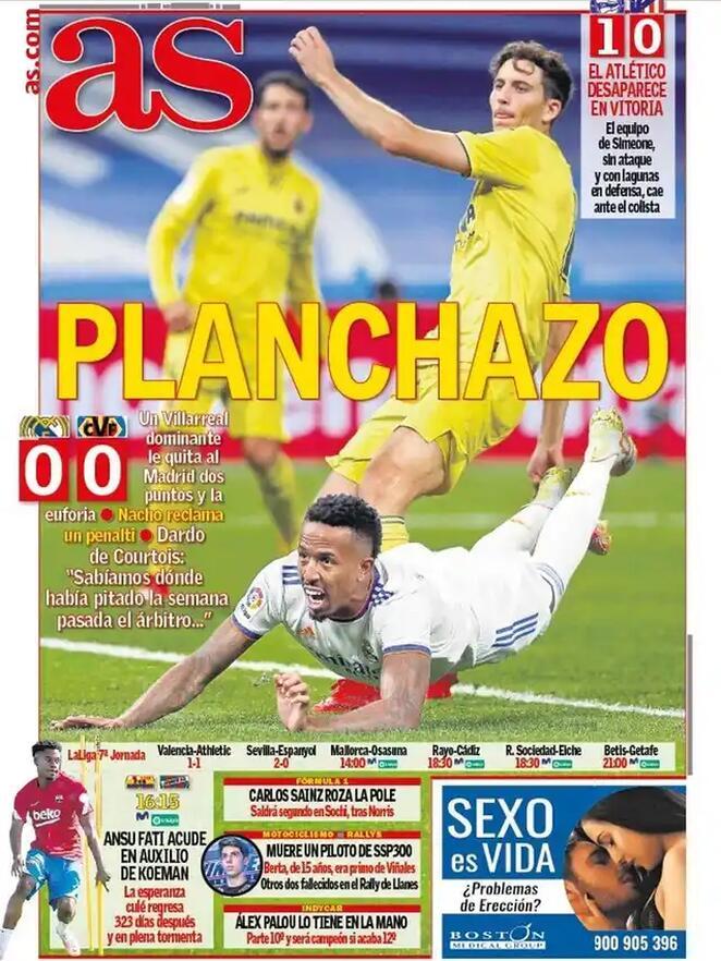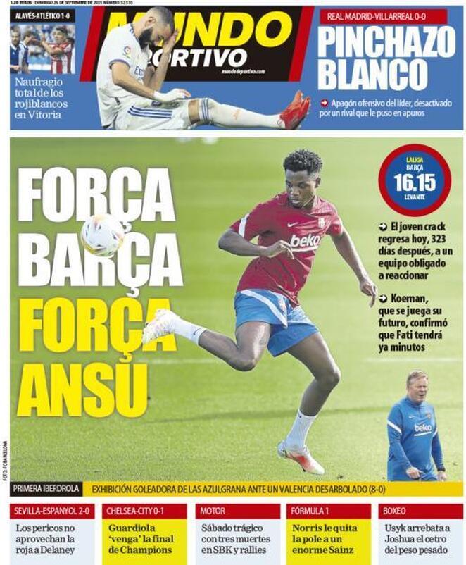 L’edizione odierna di Marca e As dedica ampio spazio al pareggio interno del Real Madrid contro il Villarreal. Sport e Mundo Deportivo, invece, si soffermano sulle vicende di casa Barcellona. Quest’oggi alle 16:15 i blaugrana ospiteranno il Levante. Una sfida che ha un po’ il sapore di “esame finale” per Ronald Koeman. Il tecnico olandese è ai ferri corti con il club catalano, ed anche i risultati lo hanno messo in una scomoda situazione. Fari puntati, inoltre, sul rientro di Ansu Fati, colui che potrebbe risollevare le sorti della squadra iberica.