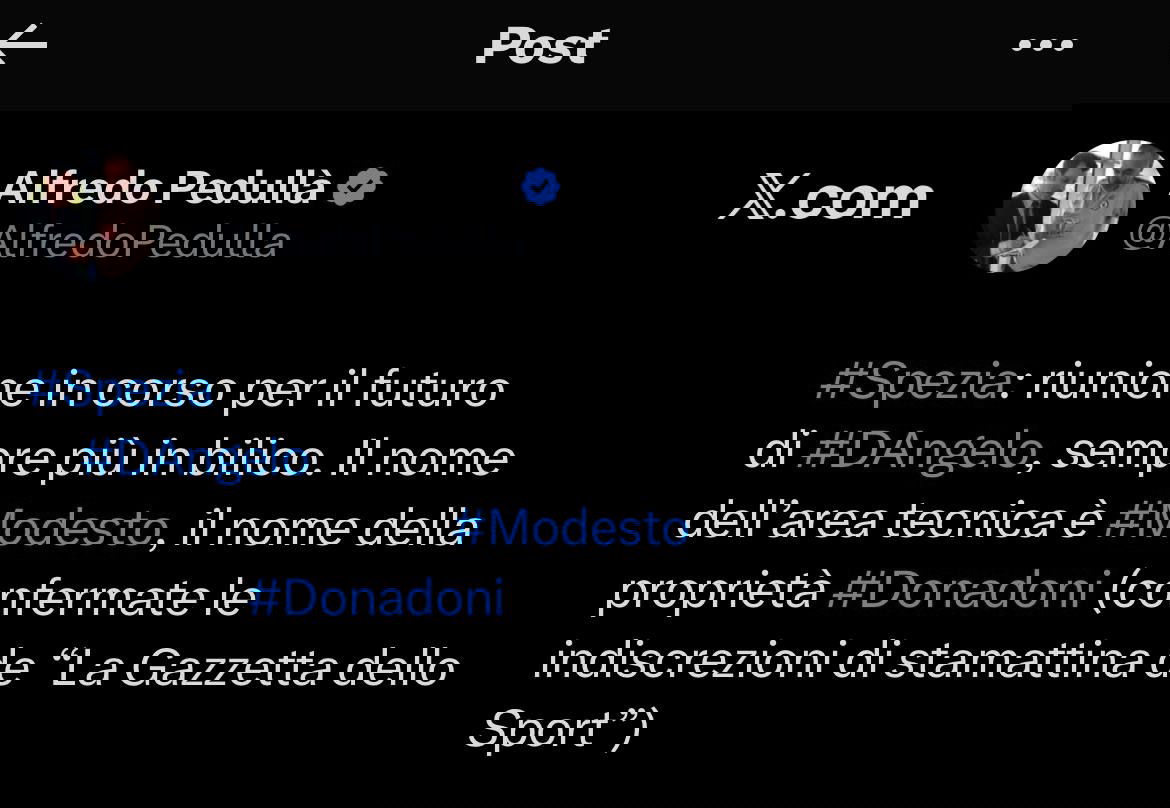 Lo Spezia cambia guida tecnica e si appresta ad annunciare l’esonero di Luca D’Angelo e l’arrivo di Roberto Donadoni. Ieri vi avevamo raccontato con un tweet che la proprietà stava decidendo per la svolta, con una riunione a sorpresa, malgrado alcune ricostruzione mediatiche avessero già data per scontata la conferma dell’allenatore “per la buona prestazione di Monza”. In realtà il destino di D’Angelo era già segnato da tempo, aveva salvato la panchina vincendo ad Avellino, avrebbe dovuto dare continuità di risultati contro Padova e Monza, invece nulla. Lo Spezia riparte da Roberto Donadoni, possibile contratto fino al 30 giugno 2028, una scelta del presidente Stillitano che aveva conosciuto l’ex commissario tecnico quando era ancora un calciatore e stava maturando le ultime esperienze a New York, storia di quasi 30 anni fa. La proprietà ha assunto una posizione diversa rispetto all’area tecnica che aveva proposto prima Pagliuca e poi Modesto. L’esordio di Donadoni è previsto venerdì contro il Bari, l’ultima sua esperienza in panchina risale al 2020 quando fu esonerato dai cinesi dello Shenzhen.