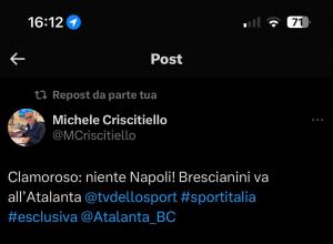Sportitalia (ore 15,42): Brescianini-Napoli no, irrompe l’Atalanta!