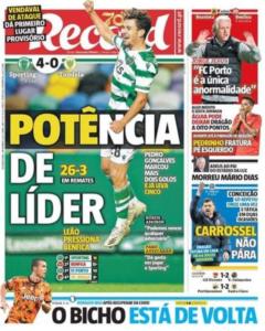 La copertina del quotidiano portoghese Record ha aperto così stamattina, con grande spazio dedicato allo Sporting Lisbona, che ha conquistato la vetta con il sonoro 4-0 rifilato al Tondela.