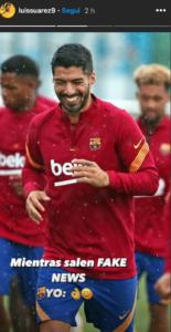 Suarez sta continuando ad allenarsi in gruppo a Barcellona mentre resta calda la trattativa che lo vede vicino alla Juventus. Nel mentre il Pistolero non stacca dagli allenamenti, sui social ha mandato una frecciatina ad ignoti. Questa la stories dell’attaccante bluagrana pubblicata su instagram: “Mentre escono fake news, io… rido (con l’emoji)”.